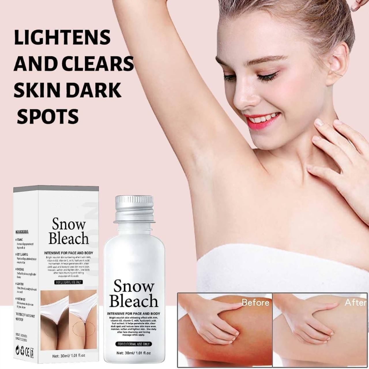 ترکیبات این محصول شامل لایه بردار آلفا هیدروکسی اسید(AHA)، ویتامین B3، C، شیر و هیالورونیک اسید است که ابتدا پوست را آبرسانی کرده و سبب شاداب تر شدن و بهبود بافت ناحیه موردنظر شده و در مرحله بعد با دارا بودن لایه بردار AHA و ویتامین های مغذی در خود باعث روشن شدن پوست، رفع تیرگی ناشی از مشکلات هورومونی، ریزش مو و … میشود. این محصول برای صورت، بدن و نواحی حساس قابل استفاده است که همانند اسمش پوست را مثل برف سفید میکند.