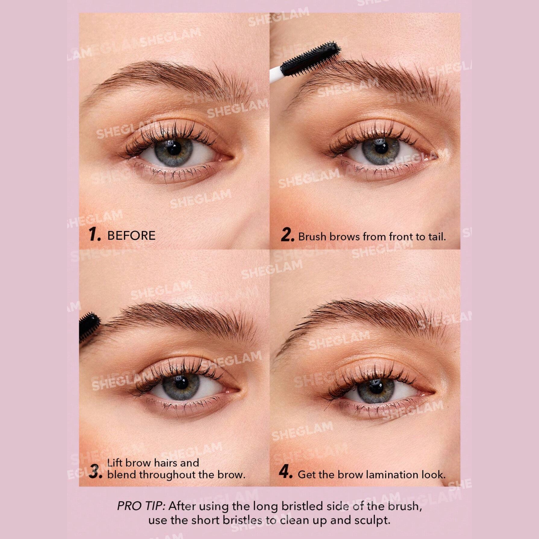 با استفاده از اپلیکاتور موجود، مقداری ژل را روی ابرو ها قرار داده ، به گونه ای که تمام ابرو ها آغشته به ژل شود ؛ سپس آنها را به سمت بالا شانه کنید و منتظر بمانید تا خشک شود.